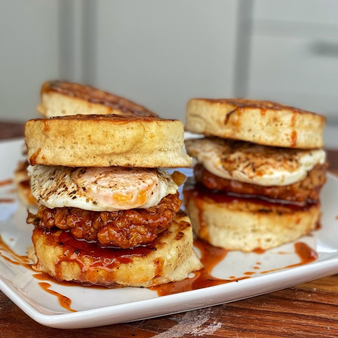 Assemble the McGriddle: Start with a pancake, add the glazed chicken, top with a fried egg, and finish with another pancake.