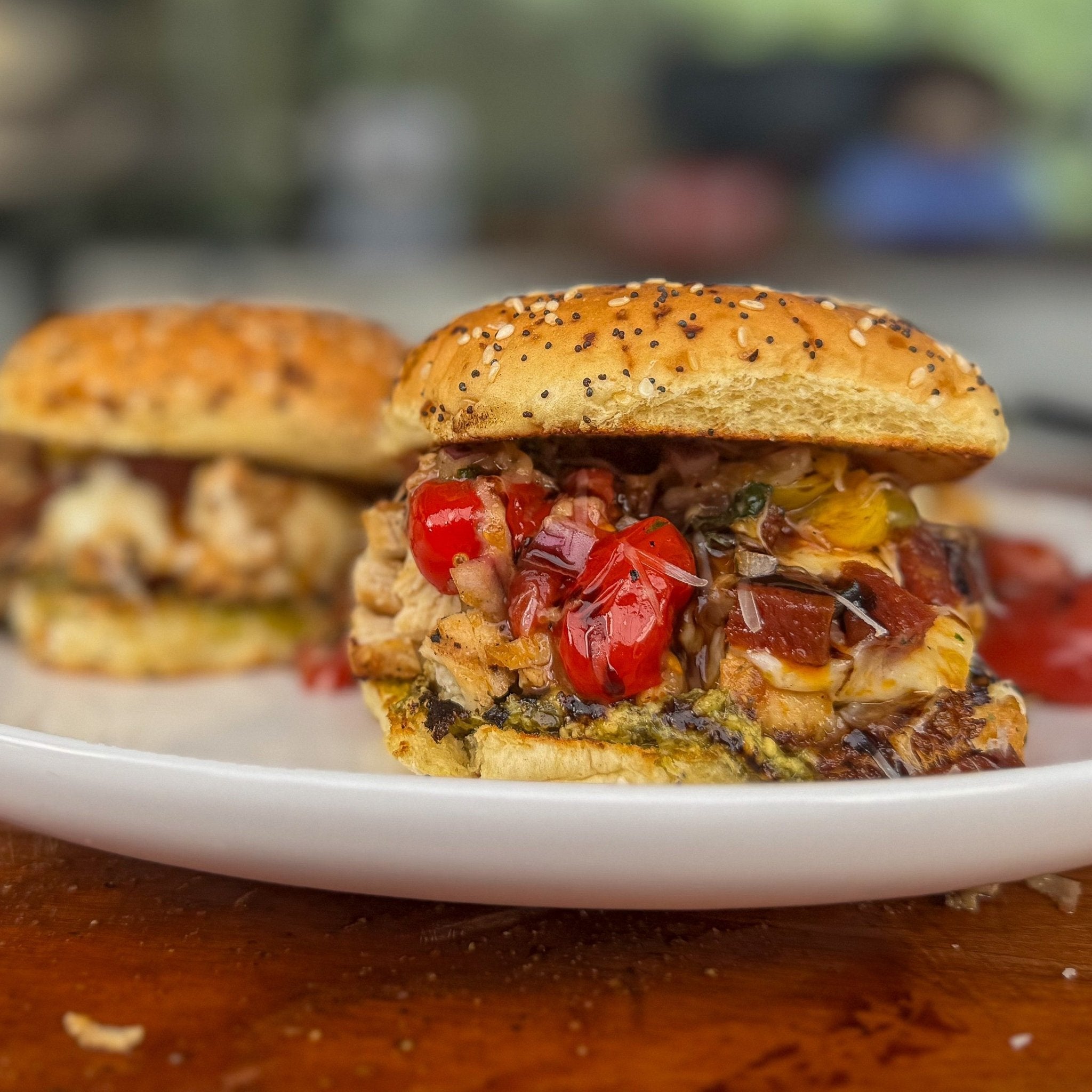 - To assemble, place a cheesy chicken-pepperoni round on the bottom bun, spoon bruschetta topping over the top, drizzle with balsamic glaze, and finish with the toasted top bun. Serve immediately and enjoy.