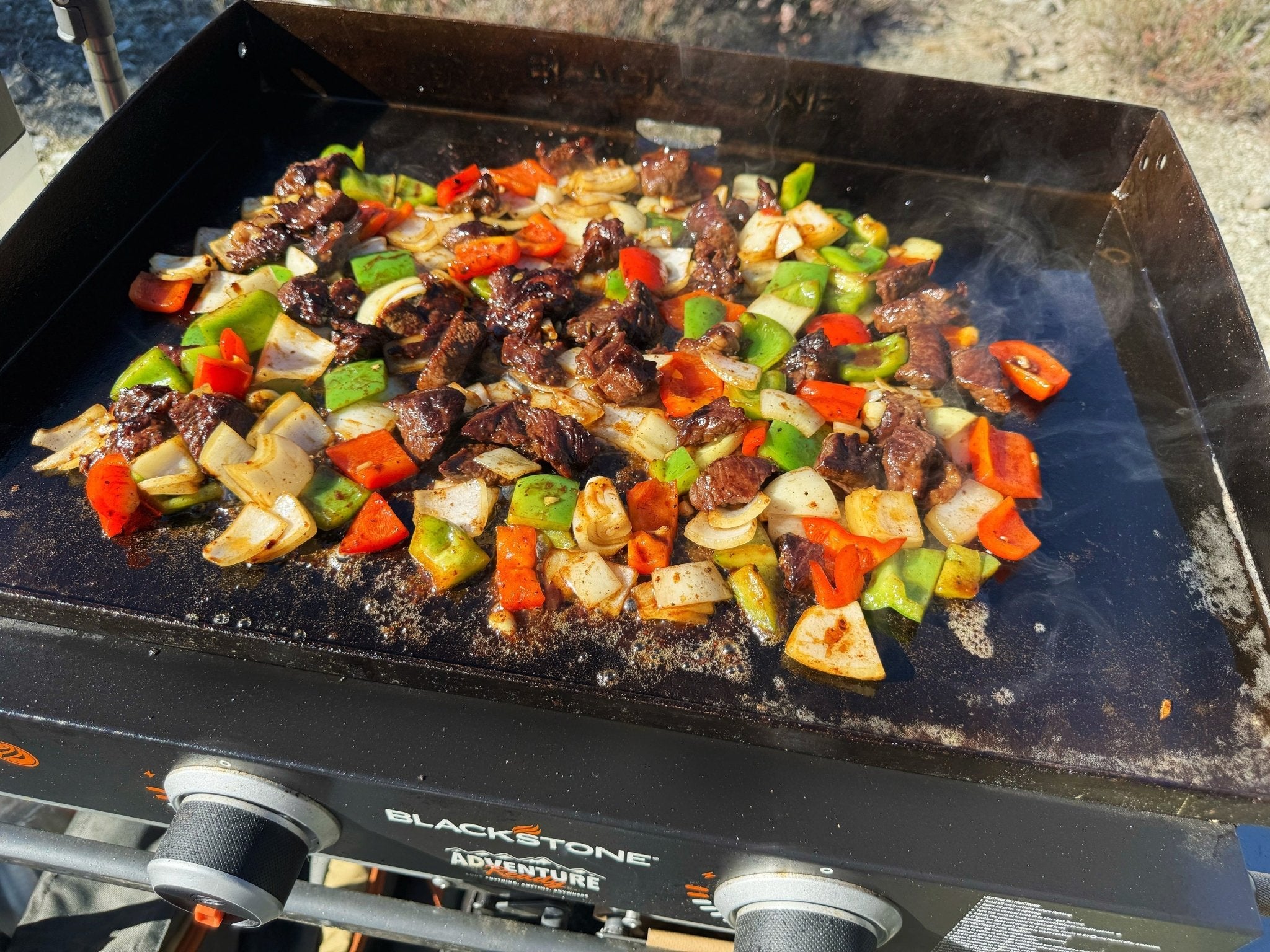 Sauté onions and garlic for 1 minute or until onions are slightly translucent. Then add red and green bell peppers and sauté for another 1-2 minutes. Set to one side of the griddle.