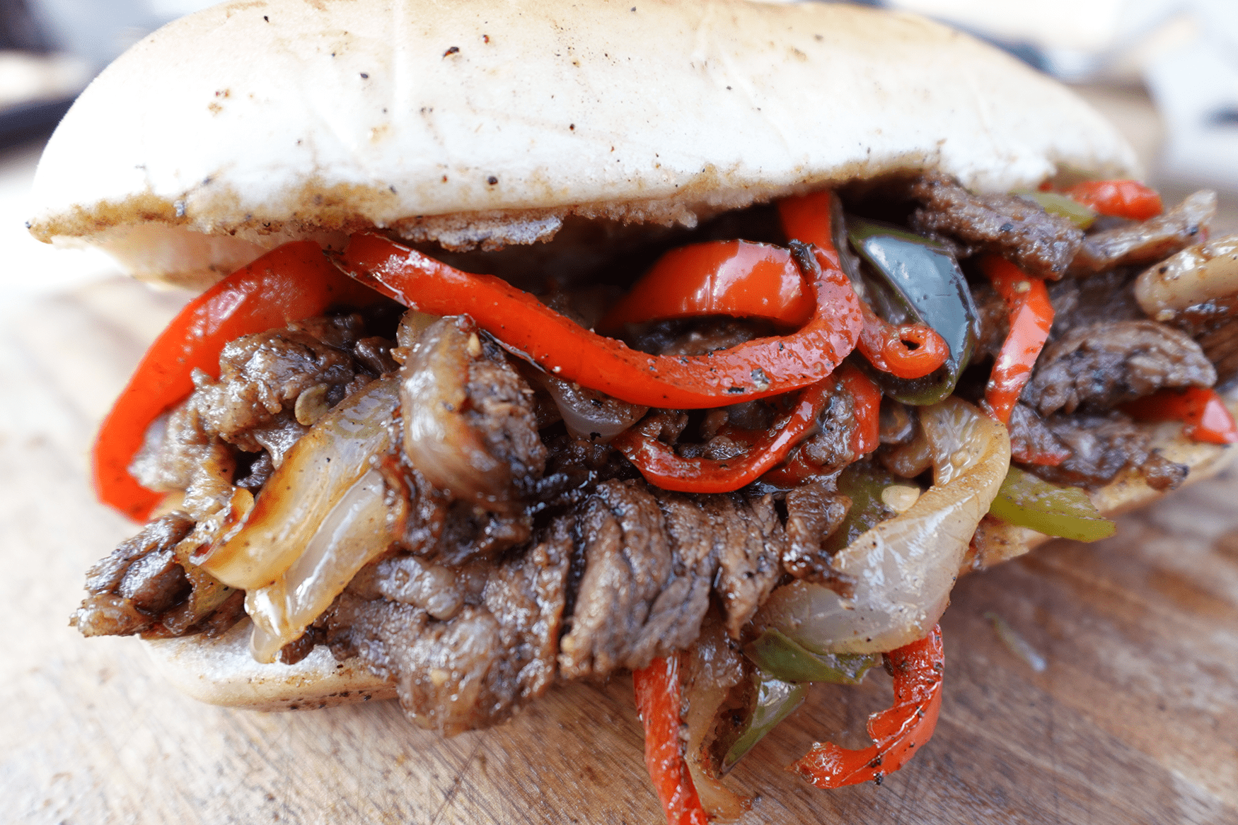 - When the cheese is fully melted, use a spatula to scoop generous portions of the cheesy meat and vegetable mixture into the toasted bread. Serve immediately and enjoy your hot, flavorful Philly Cheesesteak straight from the griddle.