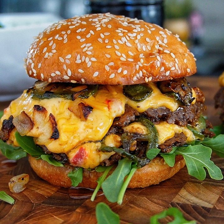 Place the beef balls on the high-heat side. Using a burger smasher (with parchment paper if desired), press each ball down firmly for 10-15 seconds to create a crust. Season with salt and pepper, then flip after 1.5 minutes. Top each patty with a scoop of pimento cheese and spread it to melt. Add the cooked peppers and onions, and cook for an additional minute. Double-stack the patties.
