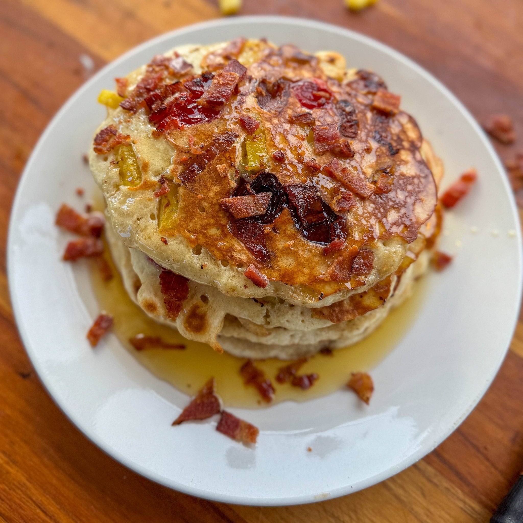 - When done, transfer the pancakes to a plate with the fruit side facing up. This will showcase the caramelized fruit and bacon, giving them an upside-down cake appearance. Drizzle warm syrup over the top and serve immediately.