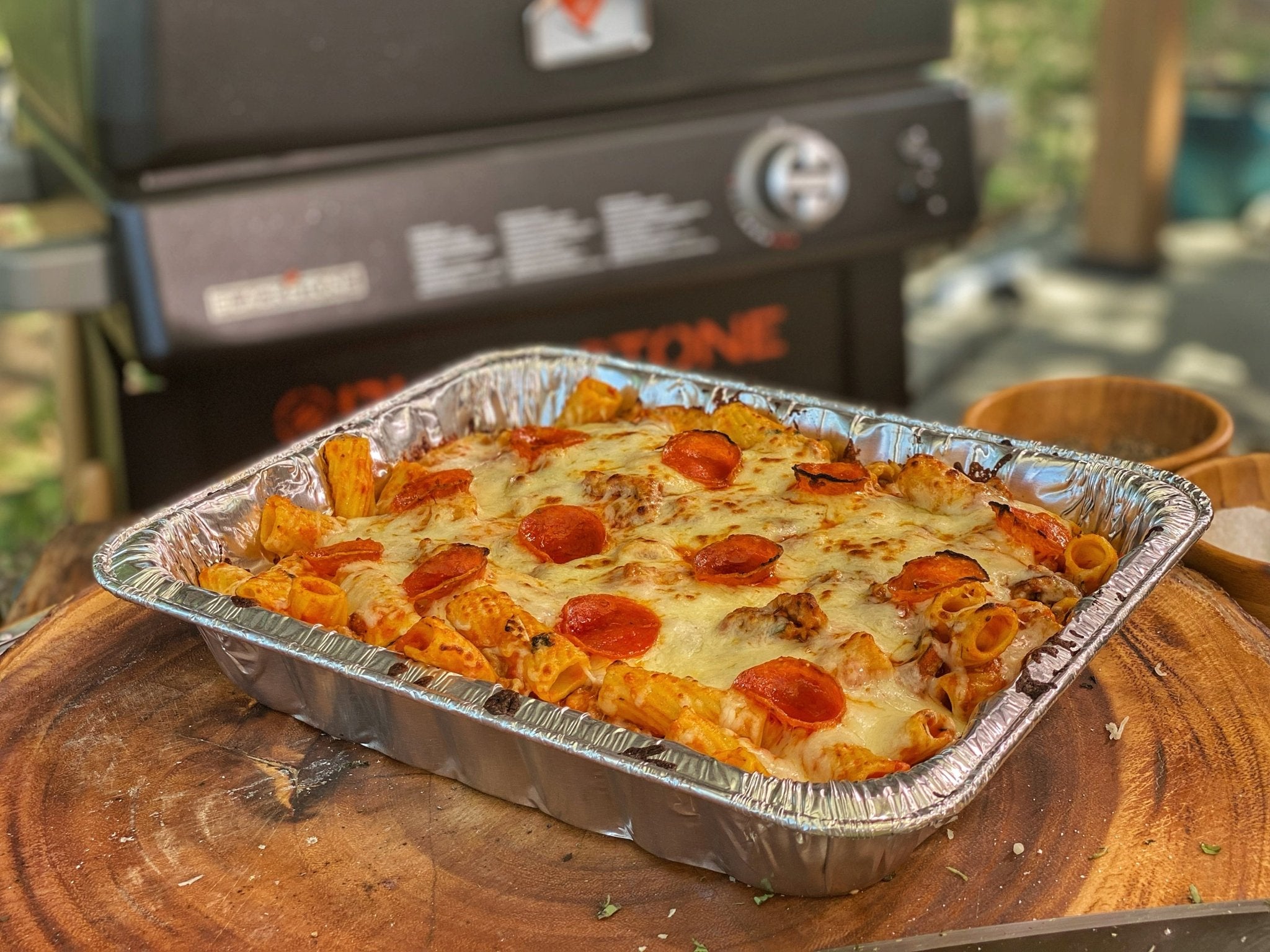 Preheat your Blackstone Pizza Oven to 500 degrees Fahrenheit and place the aluminum dish inside. Cook for 5-6 minutes or until the pasta is hot and the cheese is toasted.