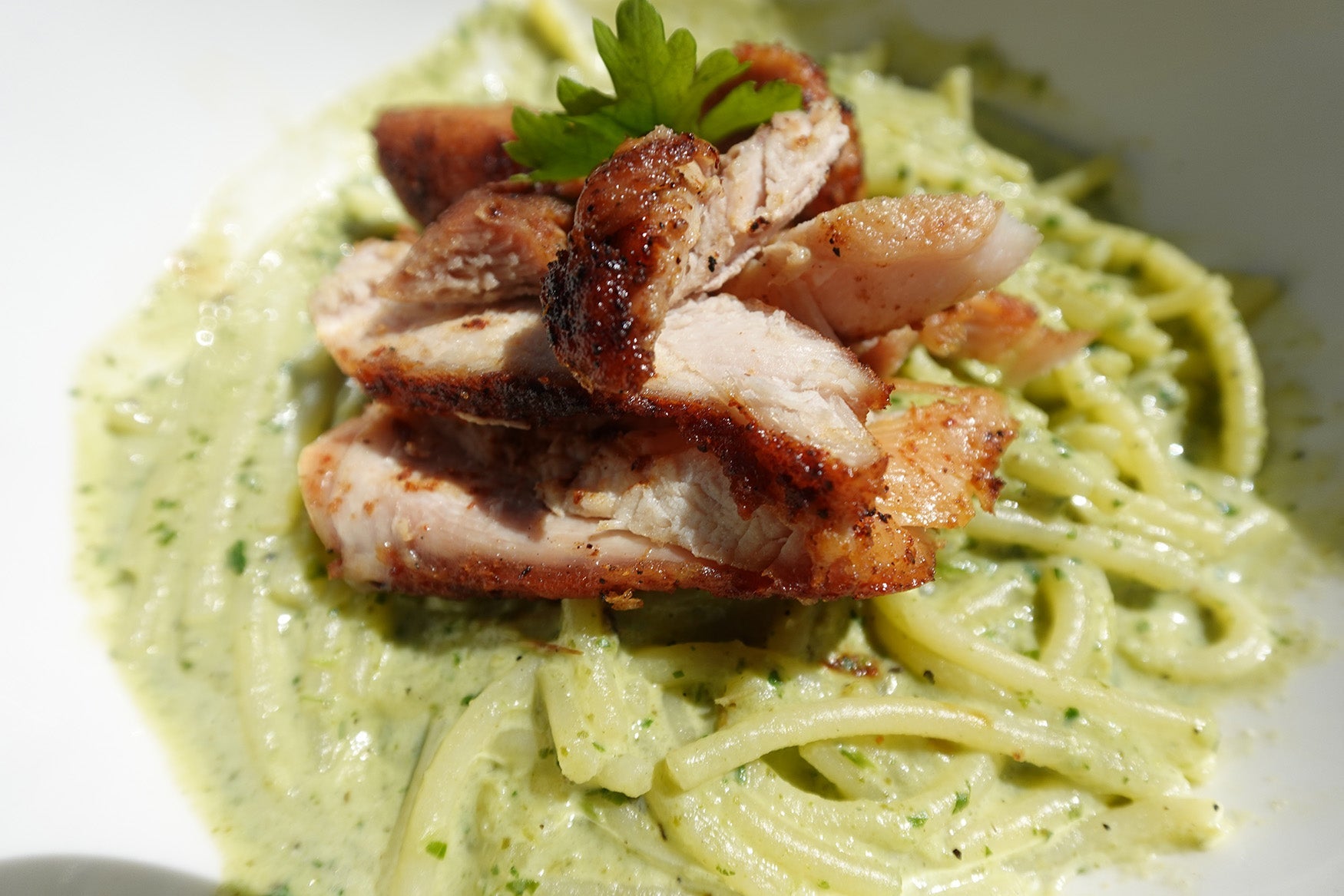 - Serve the creamy poblano spaghetti with the grilled chicken on top. If desired, garnish with fresh cilantro, crumbled cotija cheese, or a squeeze of lime juice.