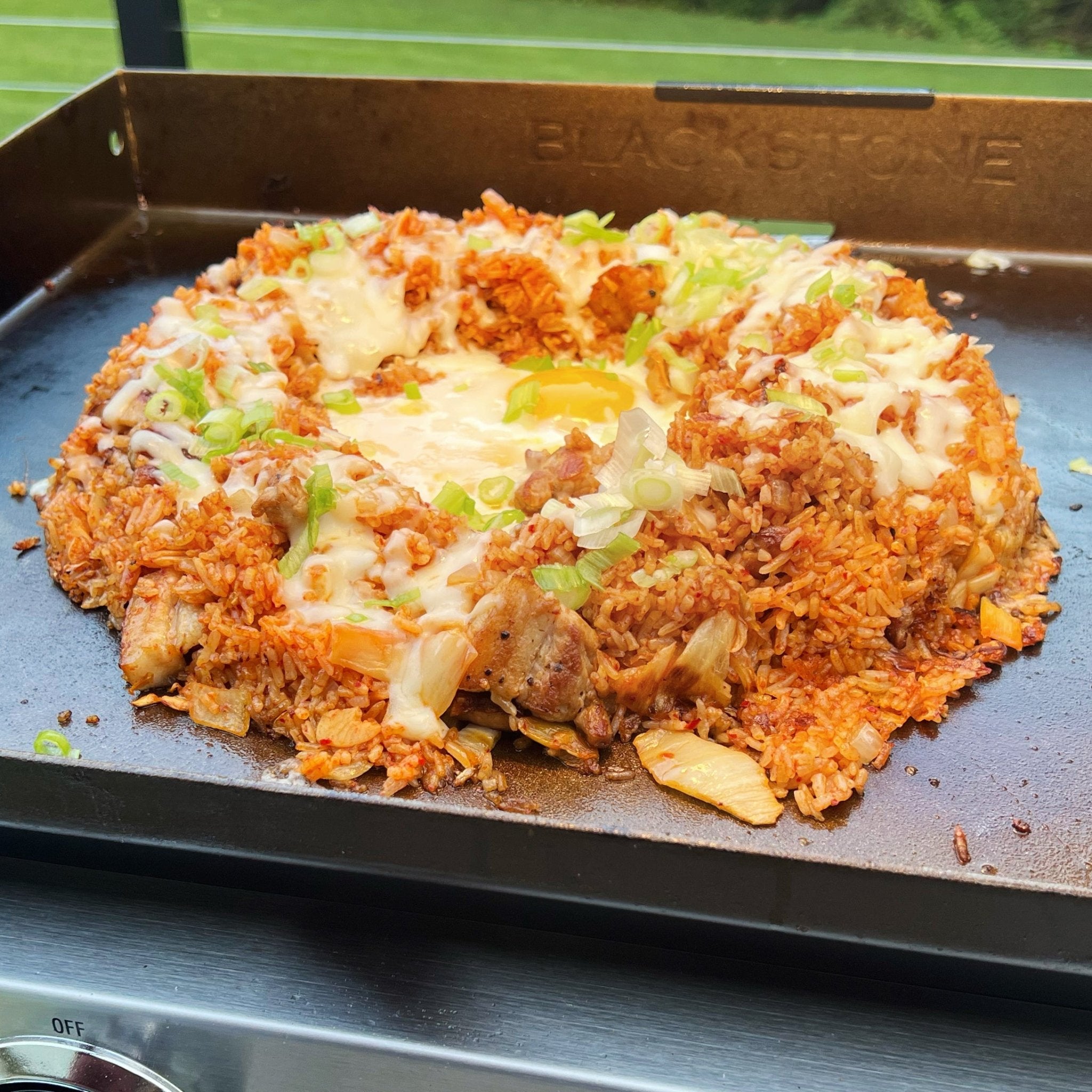 Heat a Blackstone Griddle on high. Render out the fat from the pork belly for about 3 minutes on each side. Cook until golden and lightly crispy or until the pork is cooked through. Set it aside.