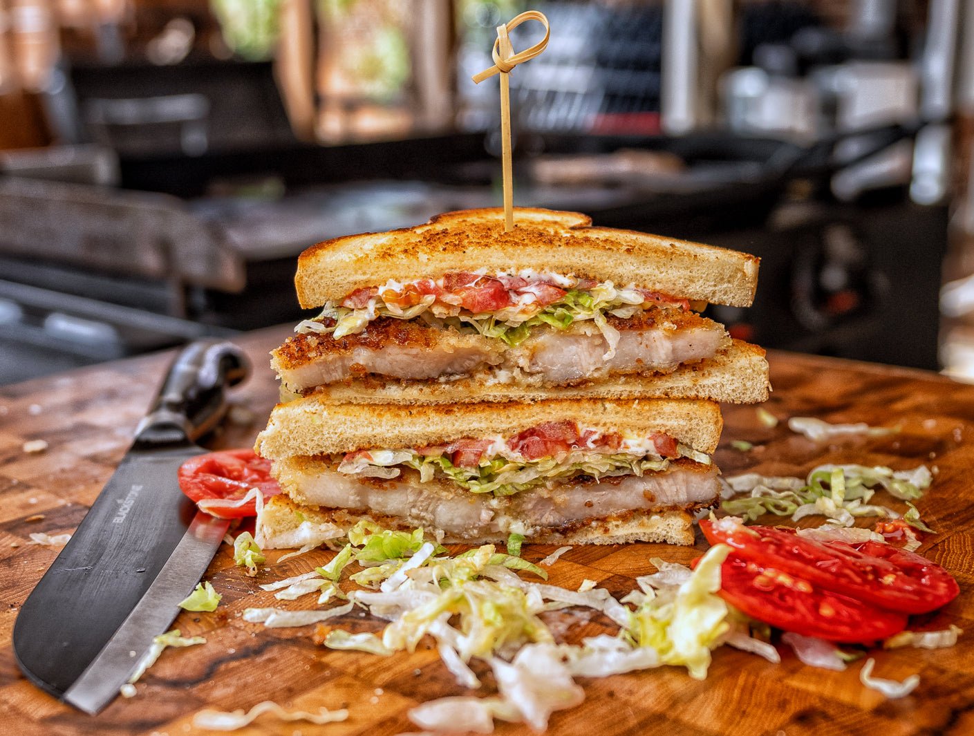 Assemble the sandwiches by spreading mayonnaise on the toasted bread, then layering with the fried pork belly, shredded lettuce, and sliced tomatoes. Season the tomatoes with a pinch of salt and pepper.