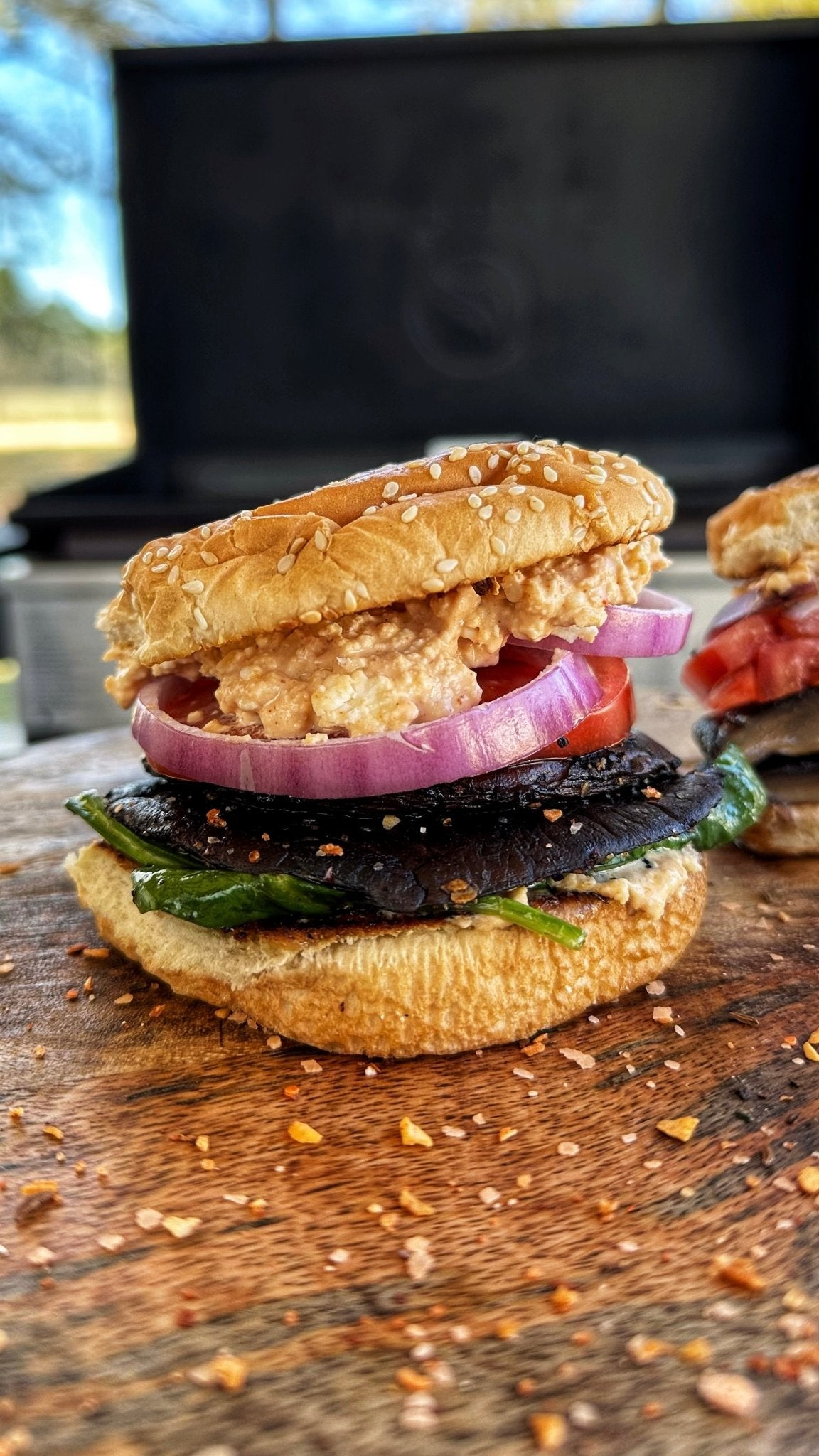 To assemble burger: spread spicy feta mixture on both sides of toasted buns. Add spinach, 2 Portobello mushroom caps, sliced tomato, and sliced onion to bottom bun, then top with the other bun.