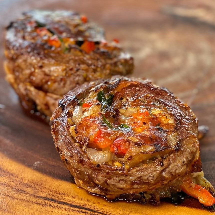 Once the steak is pounded thin, layer the cooked onions, bell pepper, spinach, and provolone cheese evenly over the surface. Starting at one end, carefully roll the skirt steak, keeping the filling inside. Secure the roll with butcher’s twine, tying it in two places. Season all sides of the rolled steak one more time. Trim off the rough ends and slice the steak in half to create the pinwheels.