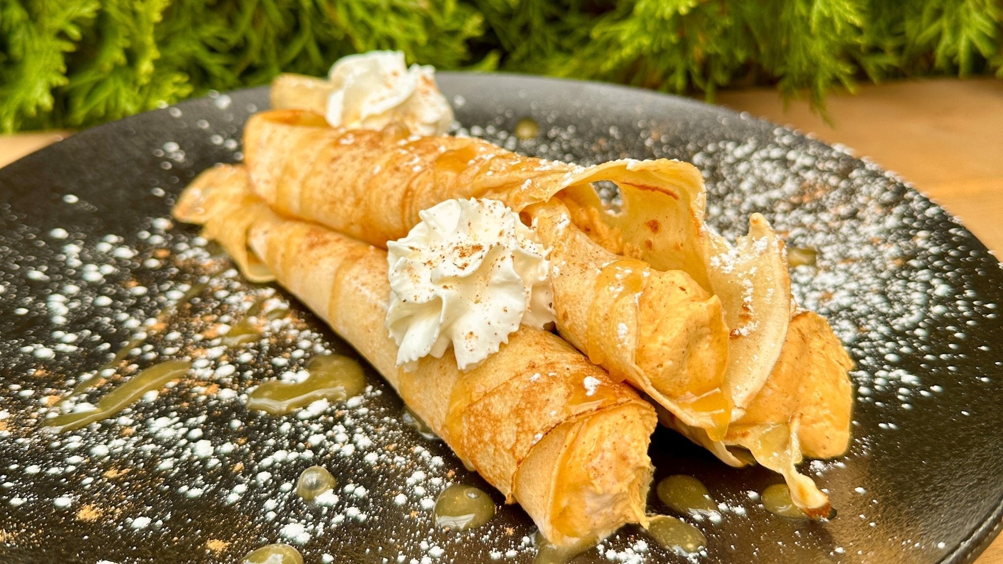 To assemble, pipe or spoon the pumpkin cheesecake filling down the center of each crêpe. Roll or fold as desired, then top with whipped cream, a dusting of powdered sugar, a sprinkle of pumpkin spice, and a drizzle of caramel.