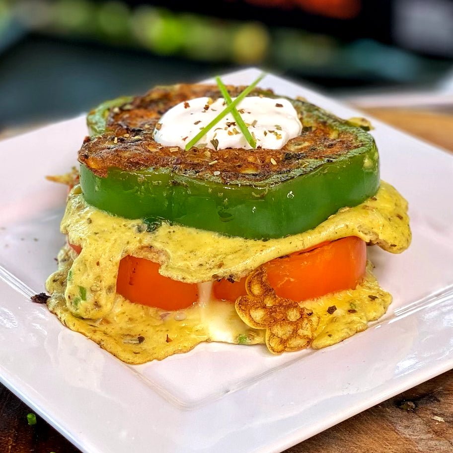 Place the bell pepper rings in the bacon fat and fill them with the egg mixture. Cook for 2-3 minutes per side, covering with a dome.