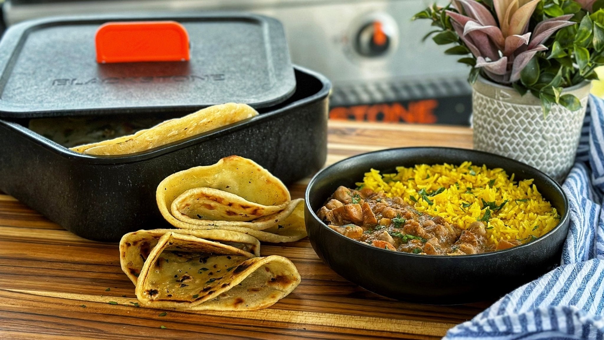 Cook each roti for 2 minutes on each side over medium/medium-high heat. Transfer to the low heat side and brush each side with the melted garlic butter. The roti should puff up as they cook in the butter. Immediately transfer them to a tortilla warmer to keep them warm and soft. If you don't have a tortilla warmer, wrap the rotis in a clean dish towel to retain warmth.