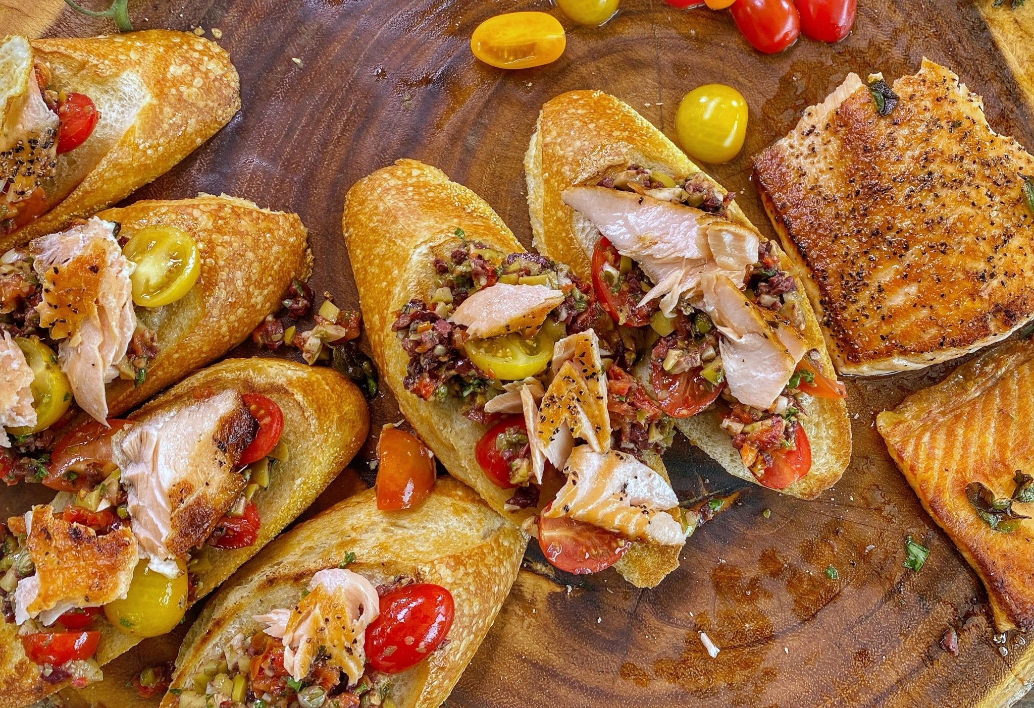 To plate, spread some of the olive mix (tapenade) onto the toasted baguette slices. Top with a few sliced tomatoes. Gently break the cooked salmon into bite-sized pieces and arrange them over the tapenade. Garnish with fried quail eggs if desired. Serve and enjoy!