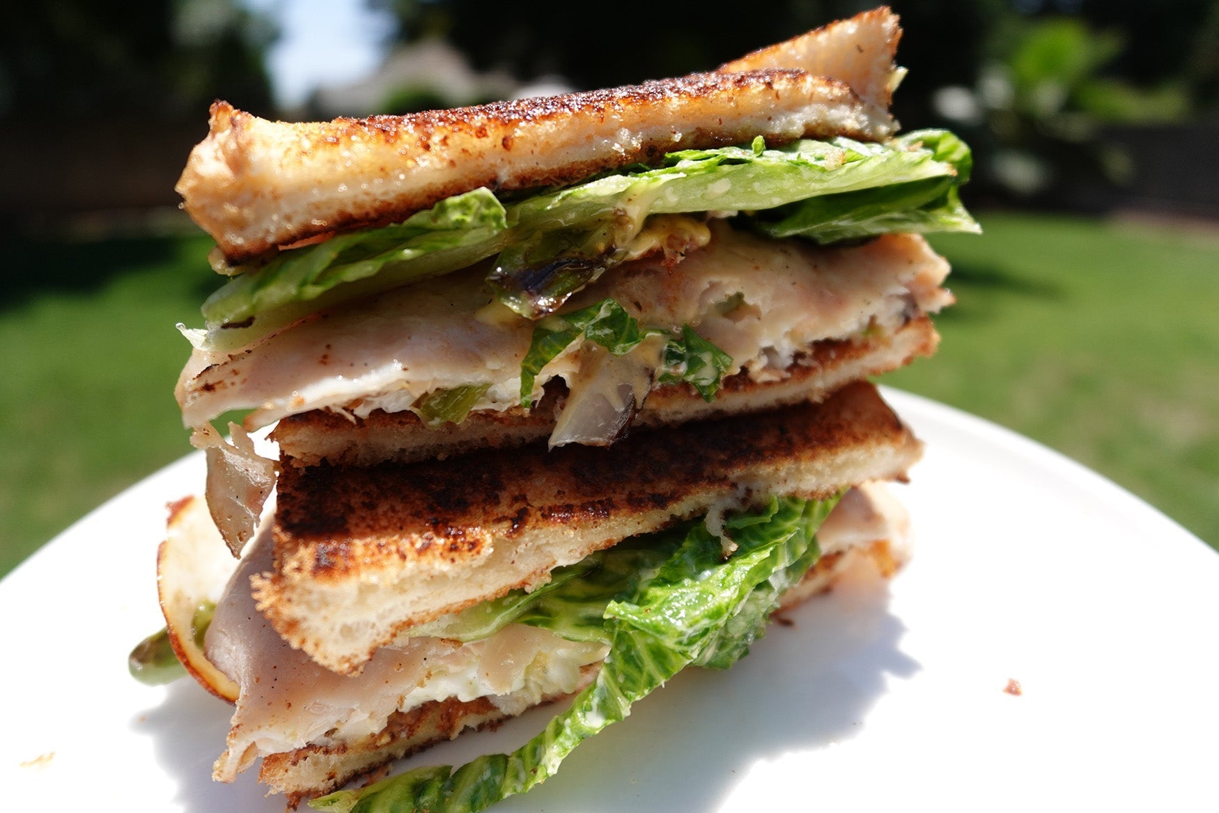 - Assemble the sandwiches: spread more mayo on the toasted bread, layer on the cheesy egg, grilled tomato, onions, peppers, two slices of turkey ham, and lettuce. Close the sandwich and serve warm.