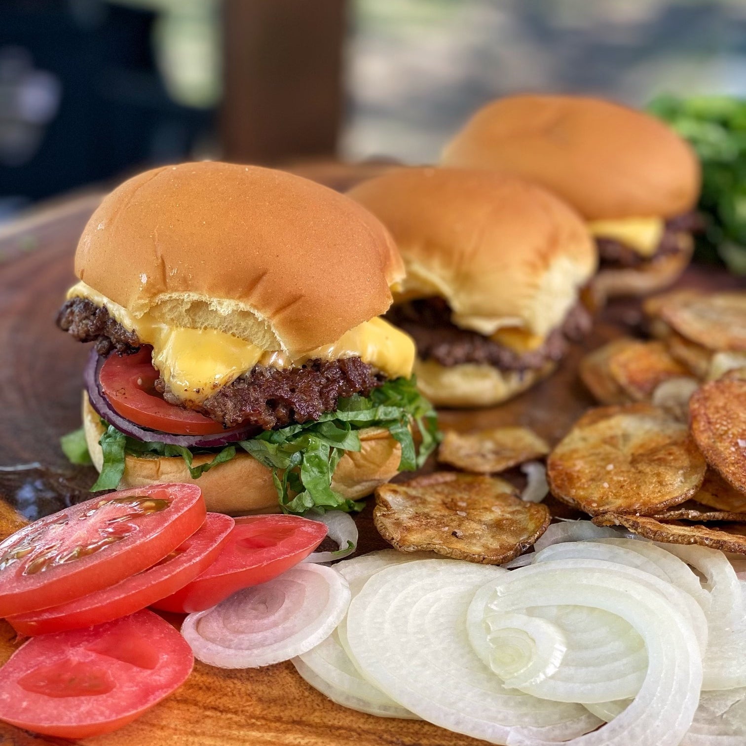 Heat your Blackstone Griddle to medium-high heat, add a drizzle of olive oil, and lay out the sliced potatoes evenly so they all touch the griddle surface. Cook for 3-4 minutes per side, then slide to the cooler side of the griddle. Avoid stacking the potatoes to ensure they crisp up evenly while the burgers cook.