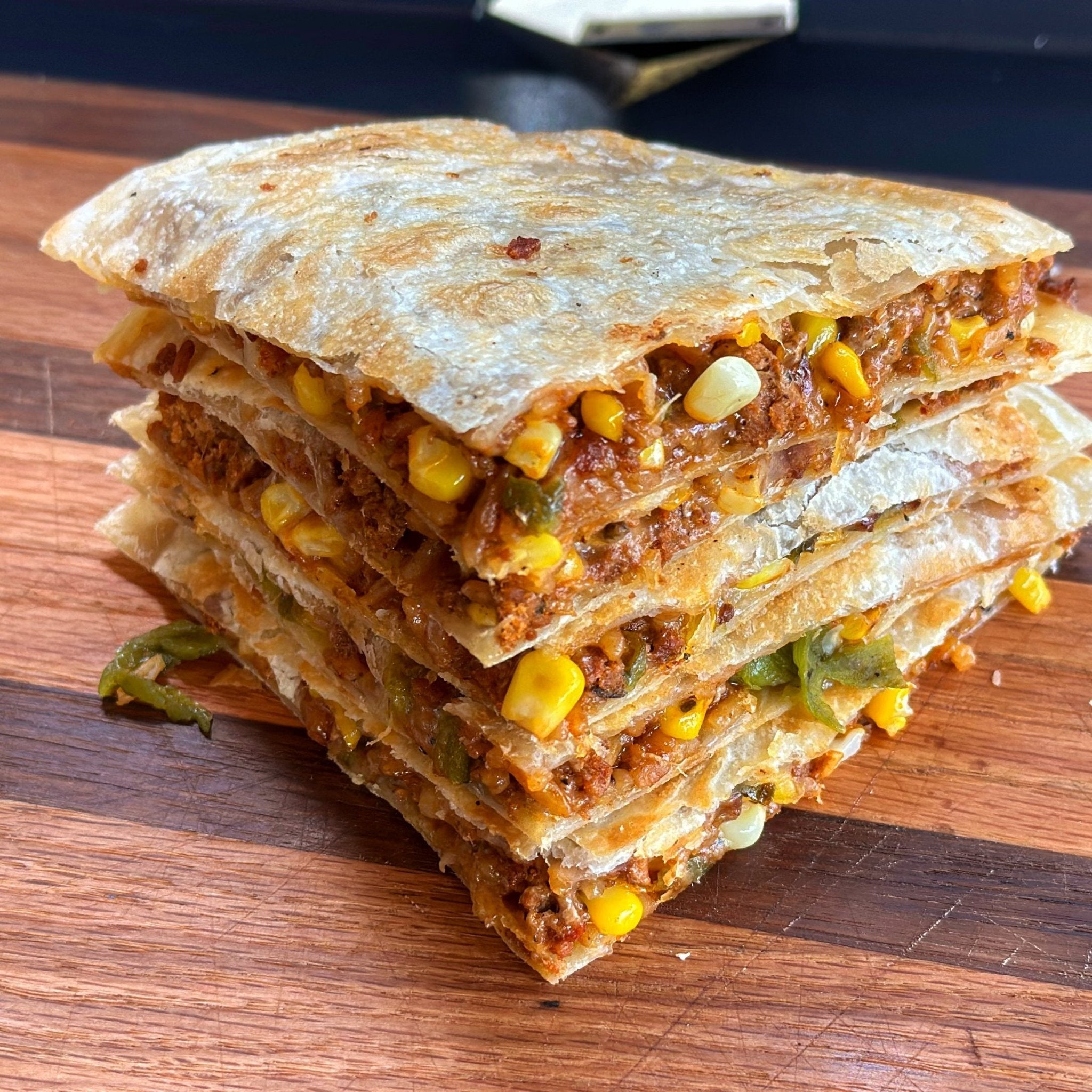 Reduce the griddle temperature to low. Lightly brown both sides of each tortilla. Place the meat mixture in the middle of two tortillas, spreading it out to the edges. Top with another tortilla and gently press down to help the quesadillas melt and stick together.