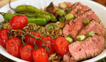 Arrange the cooked noodles on a serving platter or individual plates. Top with sautéed cabbage, cherry tomatoes, shishito peppers, and sliced filet mignon. Add the egg of your choice, if desired, and garnish with green onions.