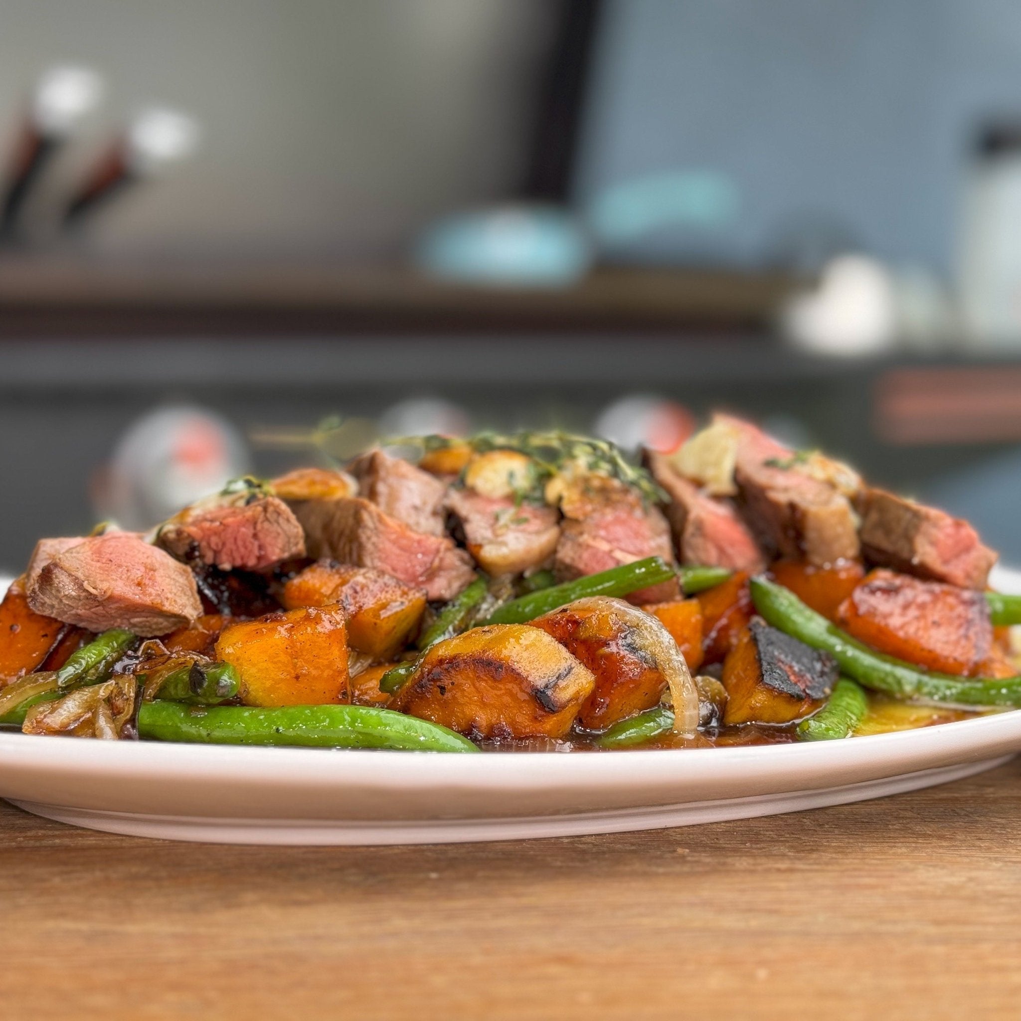 Remove the steak from the griddle, slice it thinly, and plate it with the veggies.