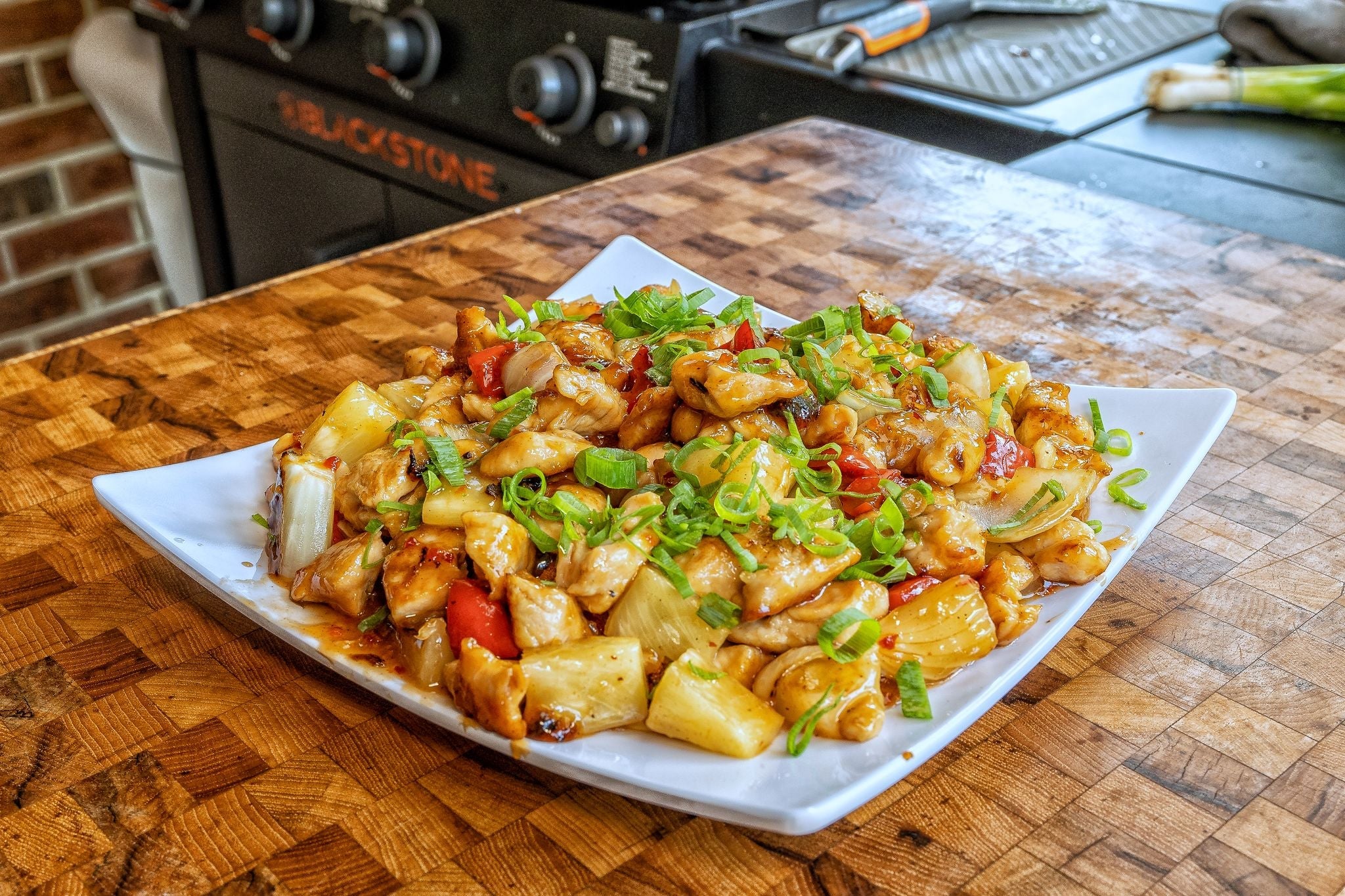 Mix the cooked veggies and chicken together, and then add half of the bottle of sweet chili sauce. Stir well and add the drained can of pineapple. If the mixture looks dry, add more sauce and some reserved pineapple juice. Mix until everything is incorporated.