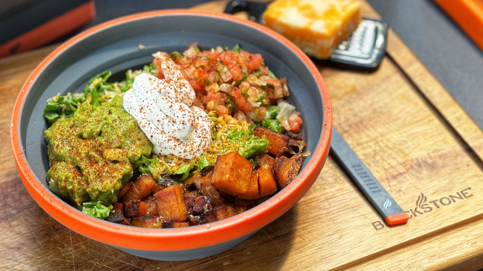 - To build your bowl, layer sweet potatoes, vegetarian beef, black beans, romaine lettuce, pico, guacamole, shredded cheese, and sour cream. Finish with a light dusting of Street Taco seasoning.