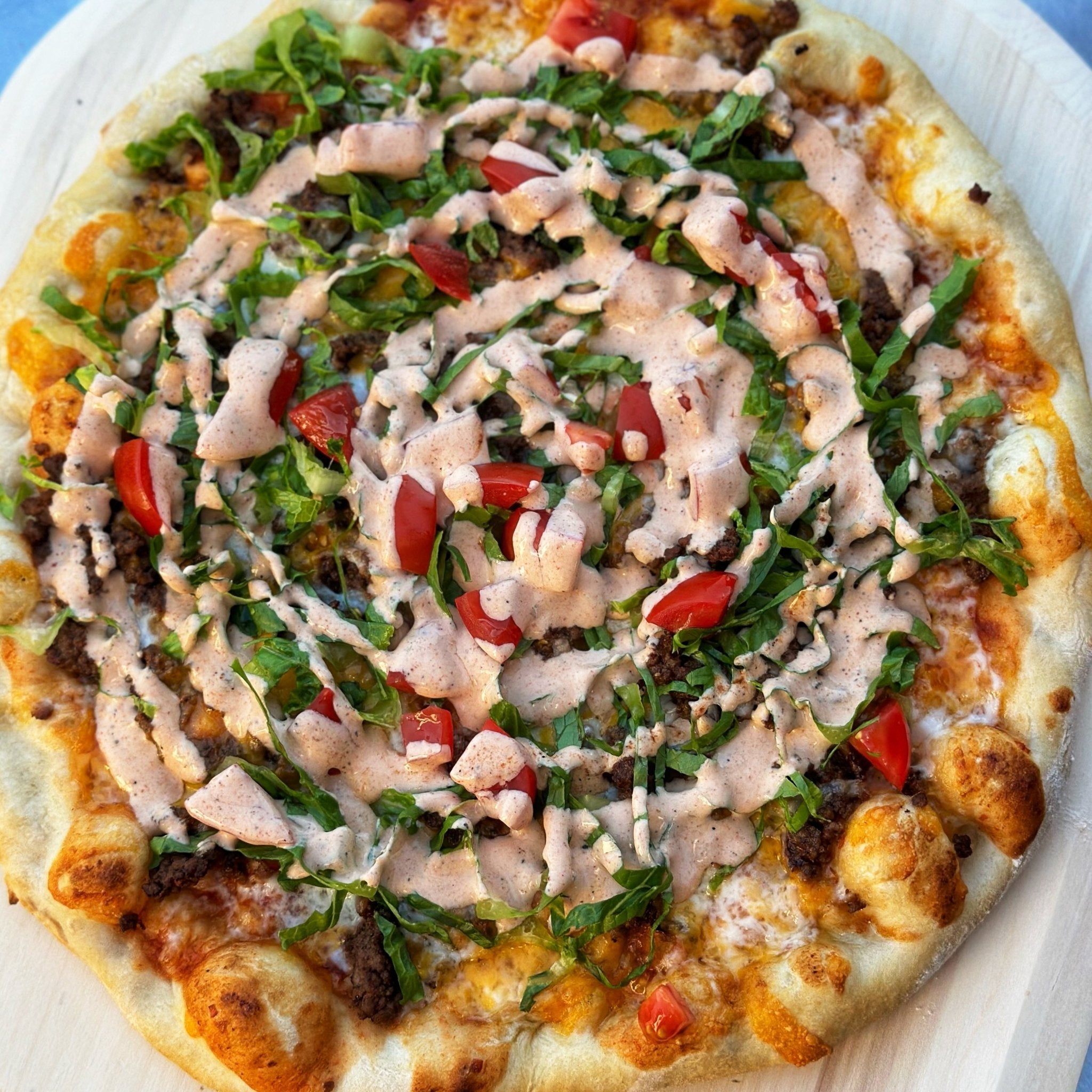 While the pizza is baking, prepare the sauce: Combine 1 cup sour cream, ¼ cup taco sauce, and 1 tablespoon taco seasoning in a jar. Shake well.