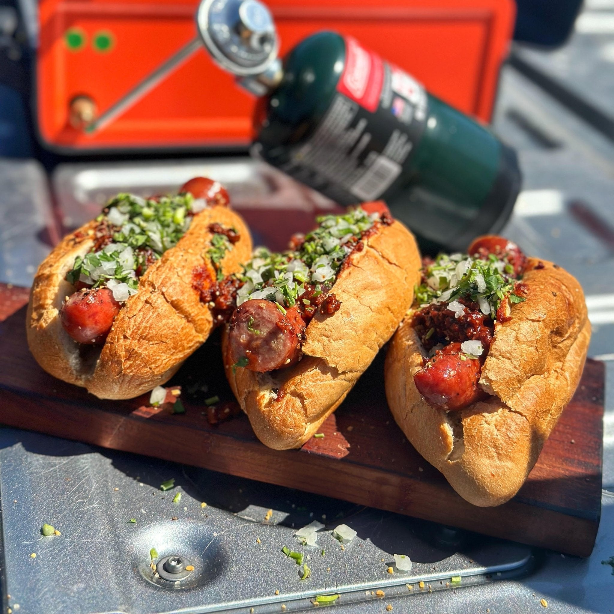 Once the sausages are warmed through and seared, remove them from the griddle and place one in each roll. Scoop chili onto each sausage.