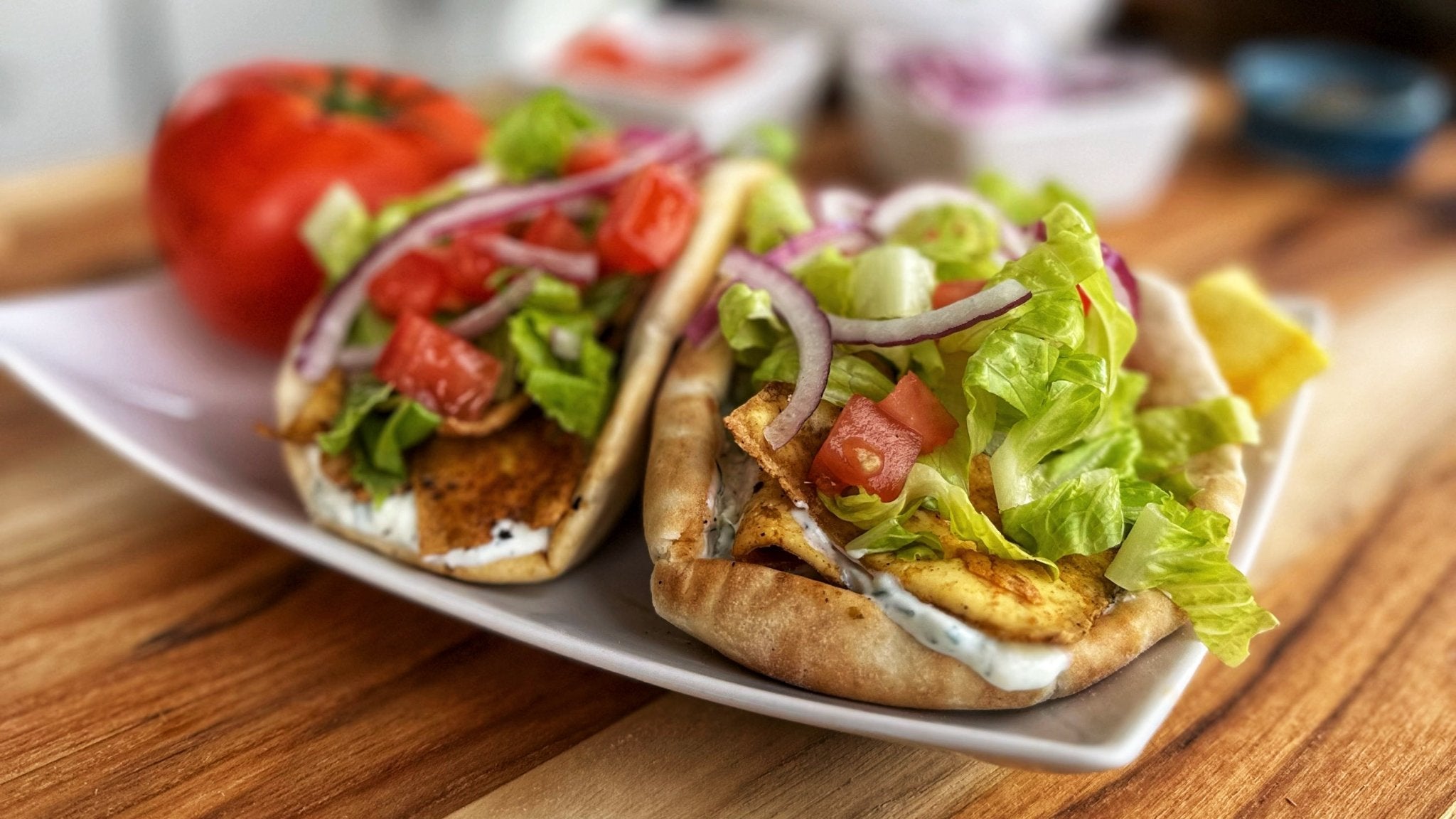 - To build the gyros, spread tzatziki sauce on warm pita, then add tofu, lettuce, tomato, and onion.