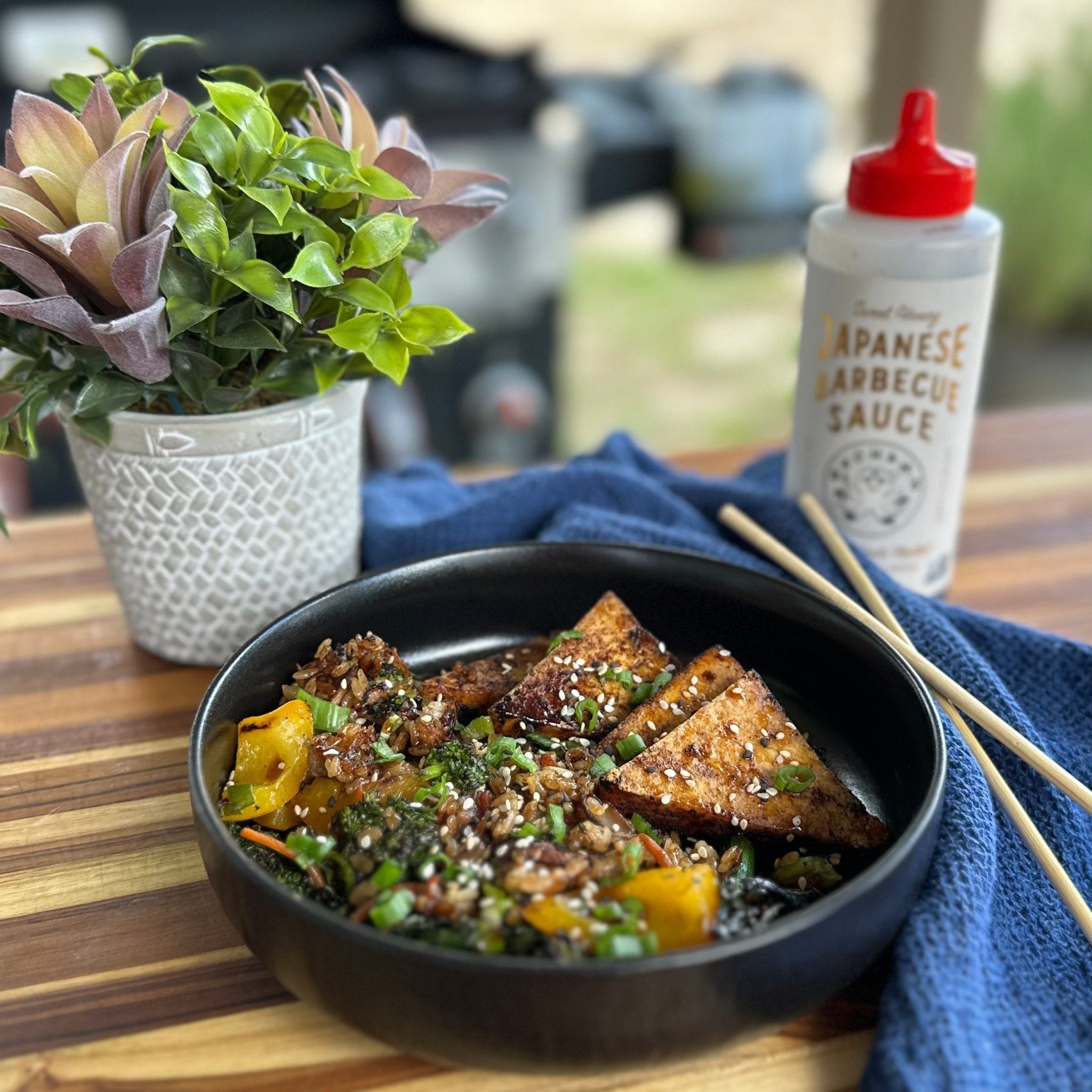 Add 1-2 tsp oil to the medium-low side. Place tofu slices on this side and cook for 2-3 minutes per side until crispy. Drizzle with Bachan’s Sauce to taste. Remove tofu promptly to prevent the sauce from burning.