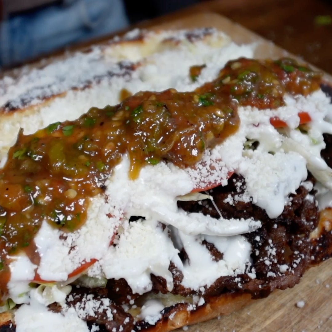- Assemble the tortas: pile on chopped asada, then add shredded lettuce, diced onion, a drizzle of sour cream, crumbled cotija, and a spoonful of salsa molcajete.