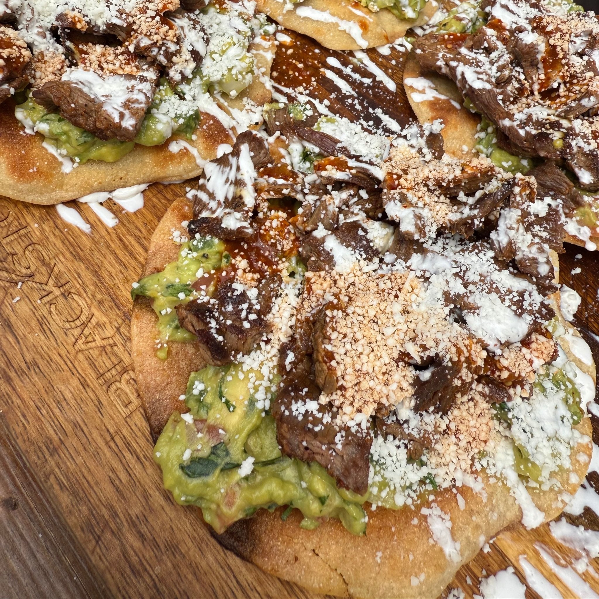 - To assemble, spread each tostada with guacamole, then add chopped asada. Drizzle with sour cream, spoon on your favorite salsa, and finish with cotija cheese.