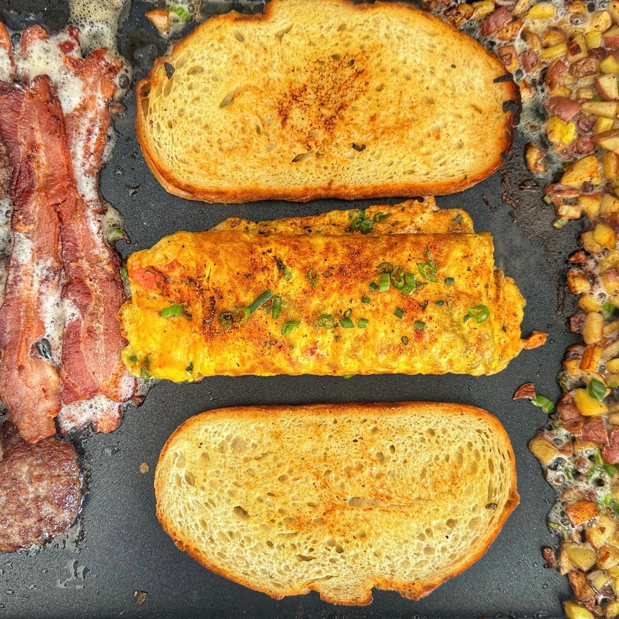 Cooking on a Blackstone griddle for breakfast is an adventure in itself! Achieving the perfect breakfast comes down to efficient time management. Begin by cooking the items that require more time first. In this recipe, we'll kick off with bacon and potatoes, saving the eggs and toast for later since they cook quickly.