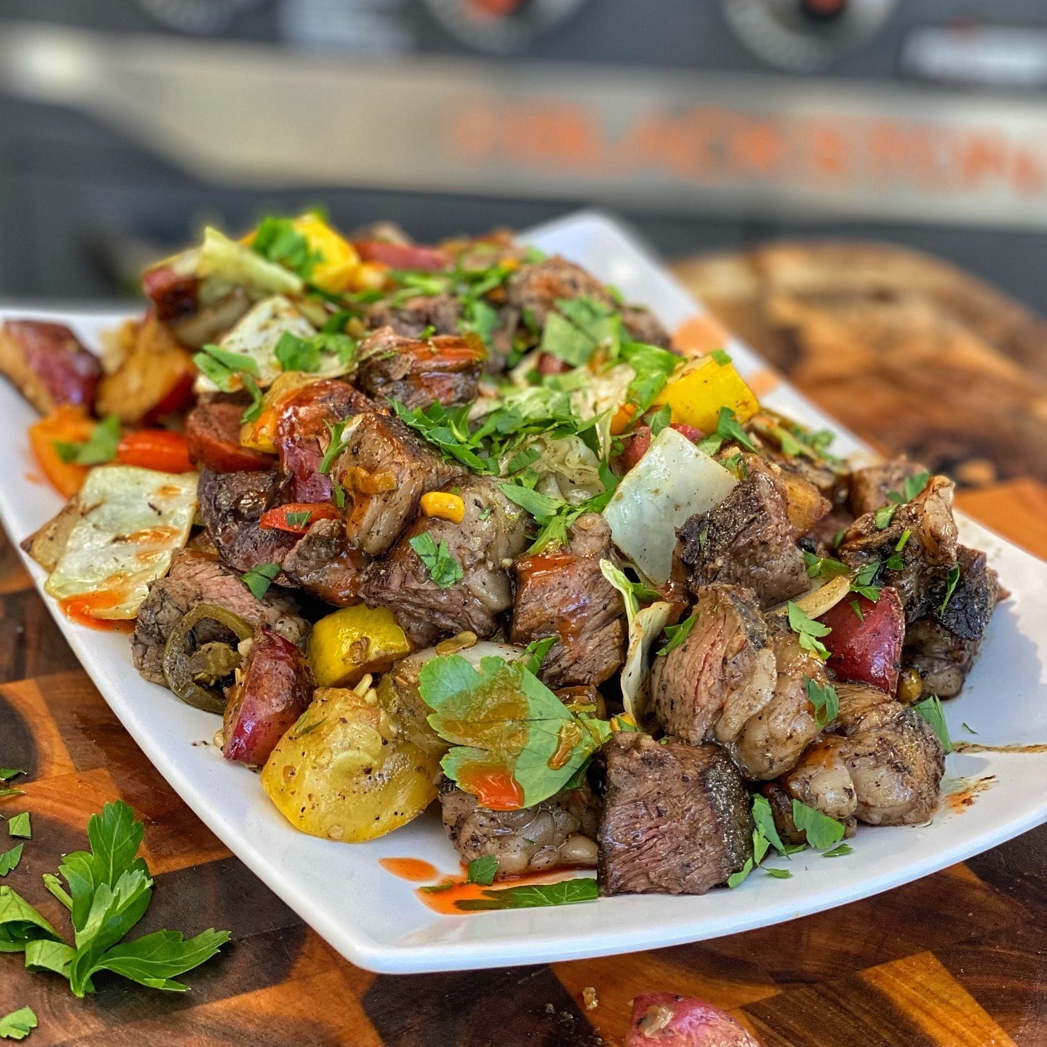 Season the potatoes, veggies, and sausage with Worcestershire, pickled jalapeño juice, diced jalapeños (to taste). Dice the medium-rare steak into large bites and add to the griddle. Drizzle with Italian dressing and another round of Worcestershire. Toss together to incorporate flavors evenly.