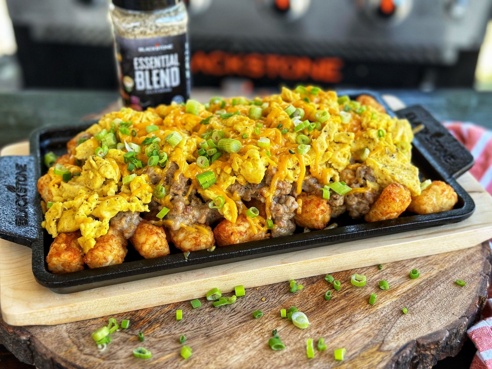 Arrange all the ingredients on a heat-safe platter (I used the Blackstone cast iron platter) in the following order: tater tots, sausage gravy, scrambled eggs, and cheese. Place the platter on the griddle, squirt some water around the platter, and cover it with the large basting dome to allow the cheese to melt.