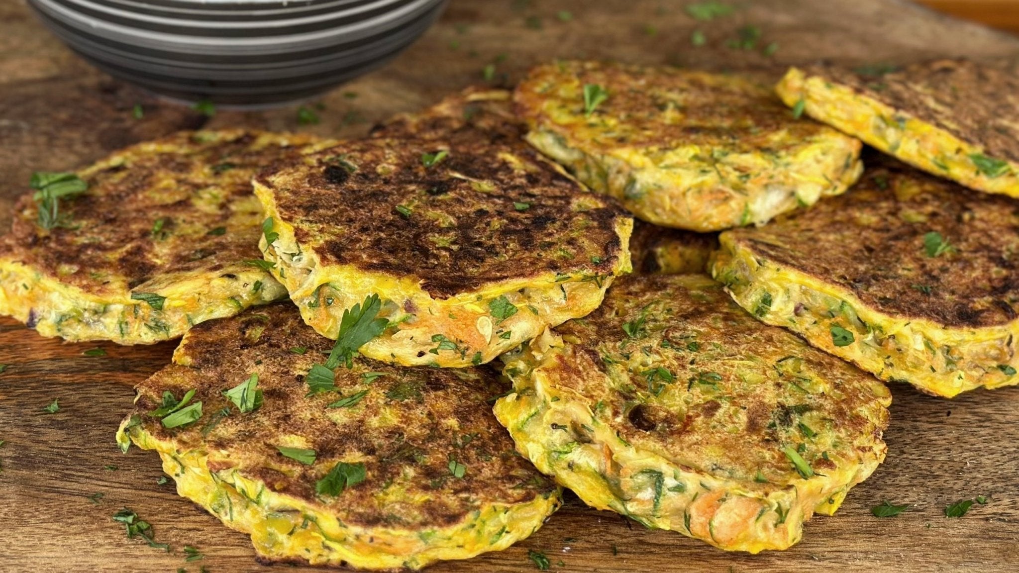 In a medium bowl mix together zucchini, squash, carrot, red onion, garlic, parsley/dill, salt/pepper, flour, and eggs.