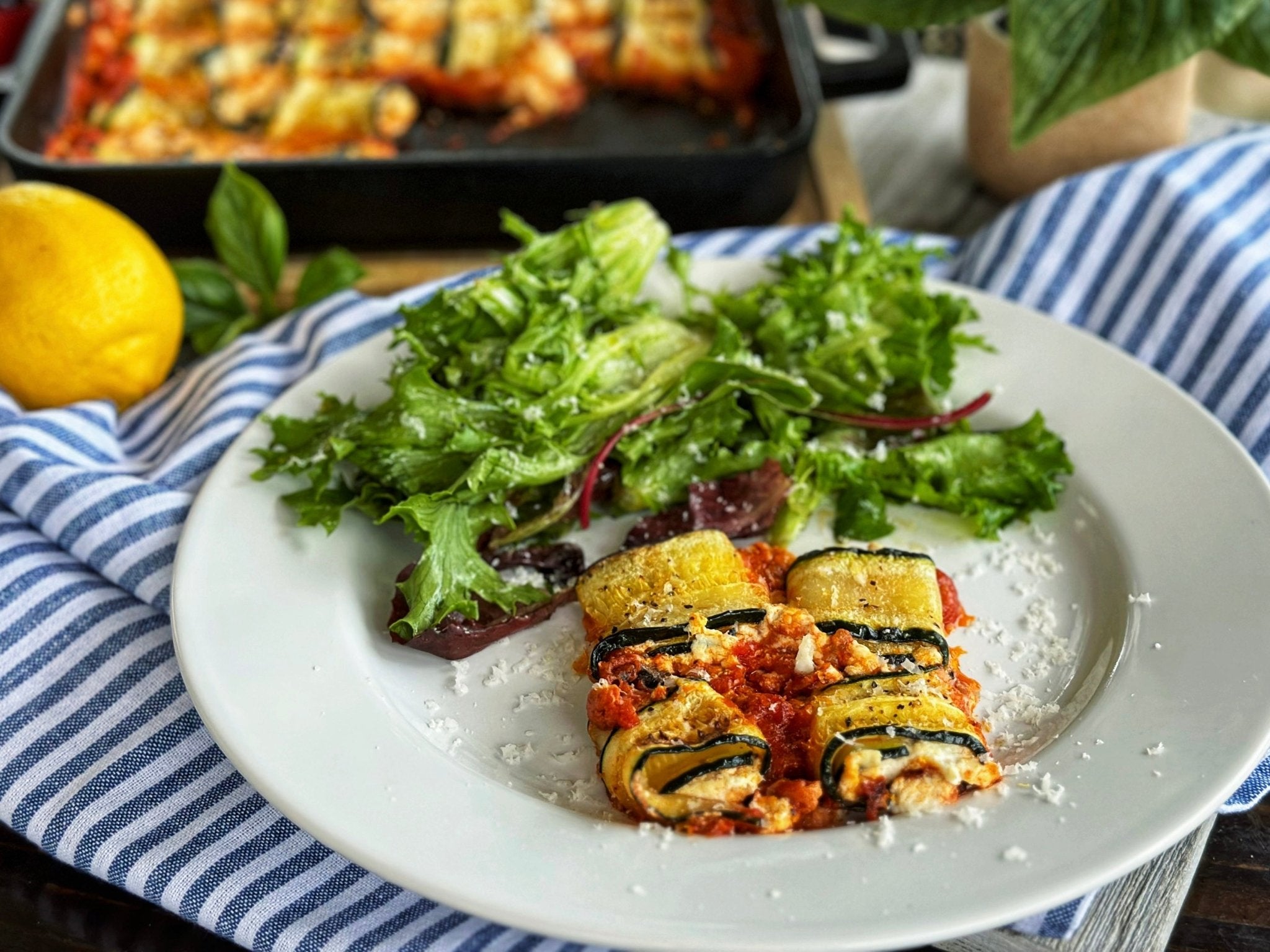 Cover the bottom of a baking dish with marinara sauce. Once the zucchini slices have slightly cooled, place 1 teaspoon of the ricotta mixture on one end of a zucchini slice and roll it up. Arrange the zucchini rolls in the baking dish. Season with salt and pepper and drizzle with olive oil. Bake in the oven for 10-12 minutes. Once finished, sprinkle the top with grated parmigiano reggiano cheese.
