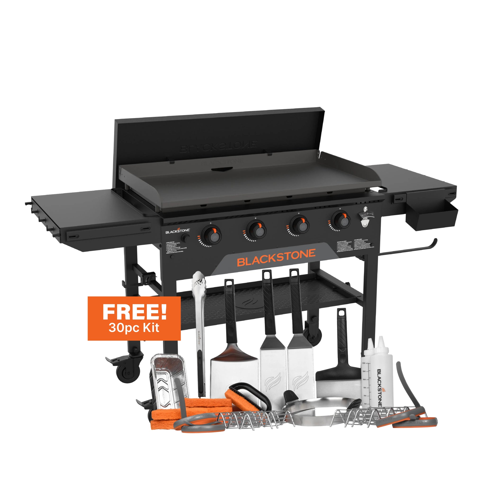 The griddle includes Omnivore Griddle Plate, Rear Grease Management, protective hood, side shelf hooks, BAR System, and accessory bin.